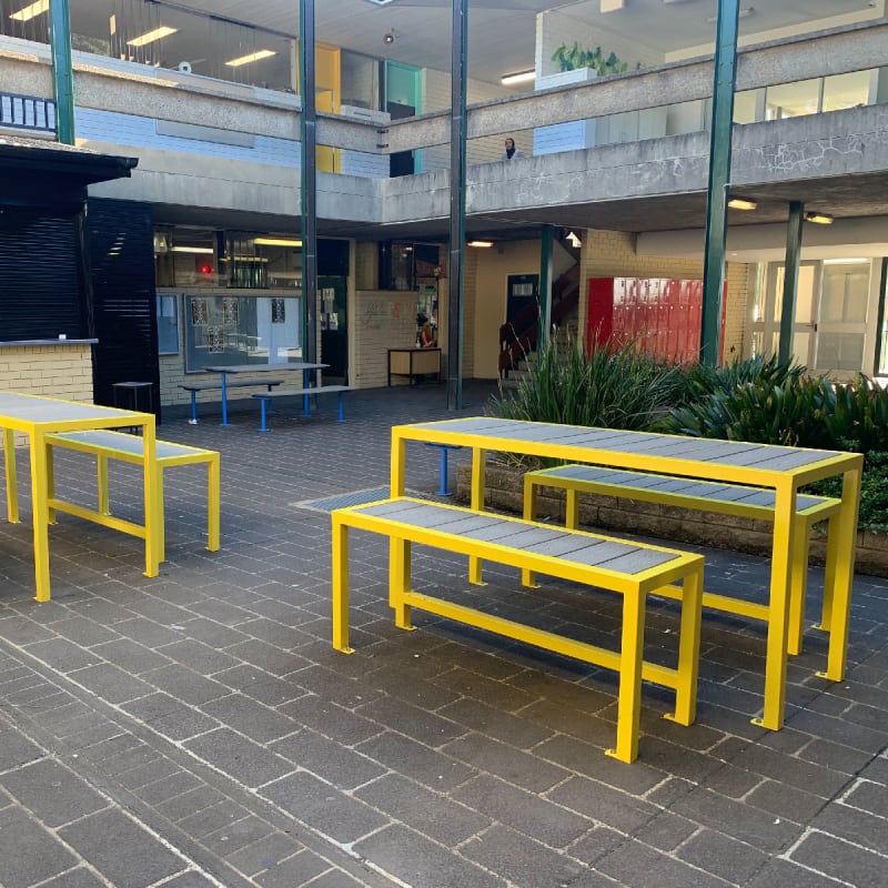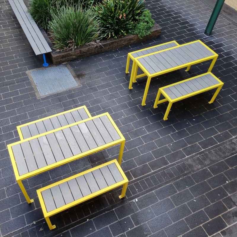 Contemporary bar height table. Light in scale. Hardwood, Duraslat™ battens or slotted compact laminate with a slim-line steel frame.