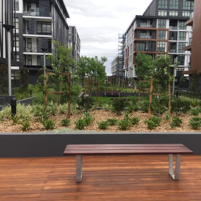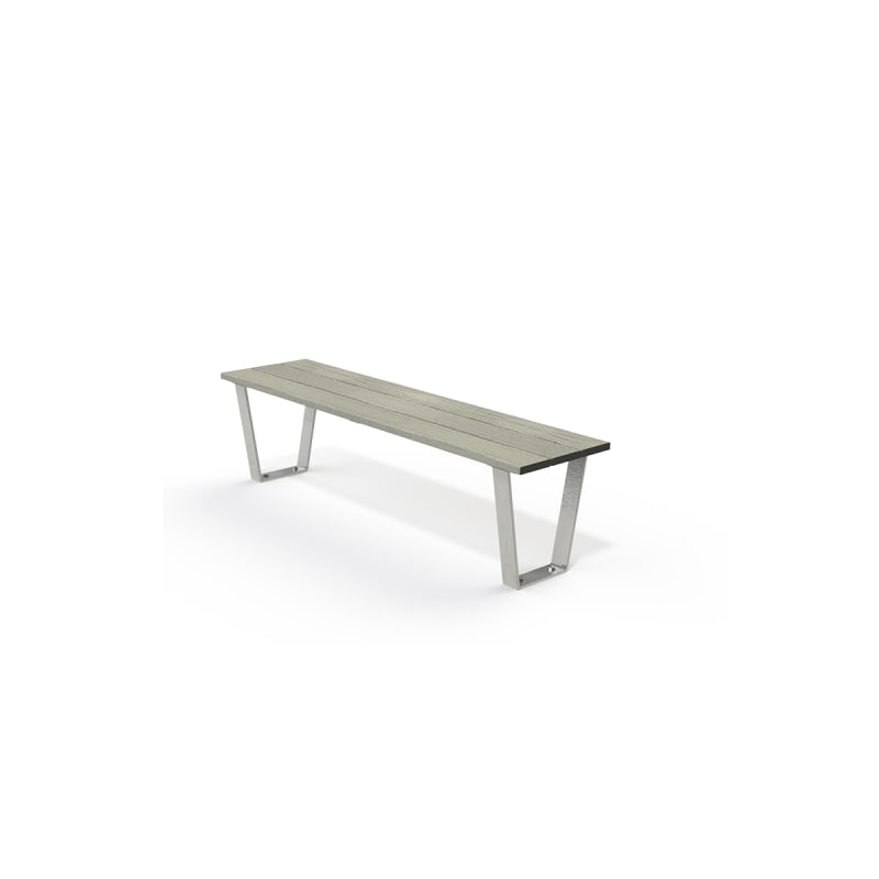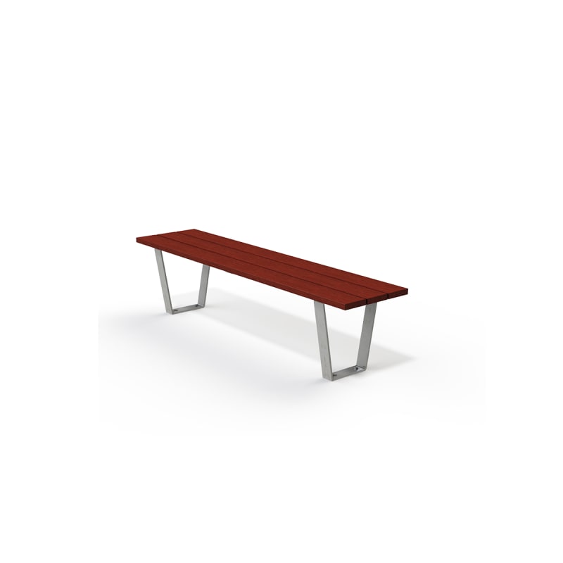 Minimalist bench design. Batten top in hardwood, Duraslat™ XG and aluminium with a tapered steel frame in 27 powder-coat or galvanised finishes.