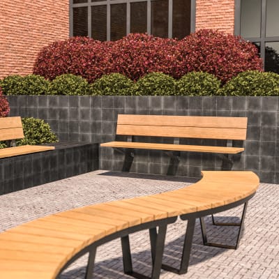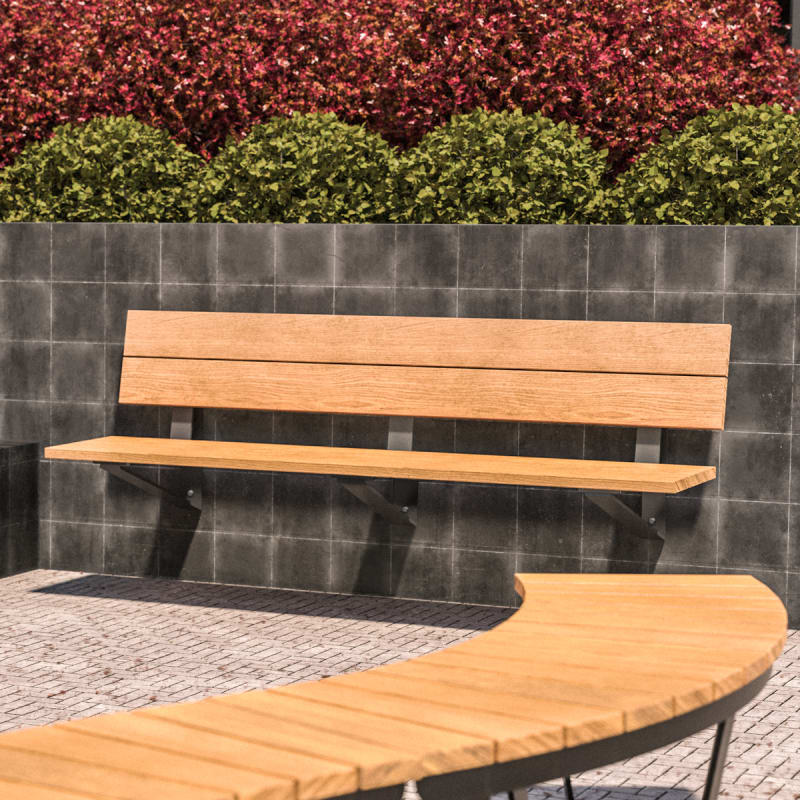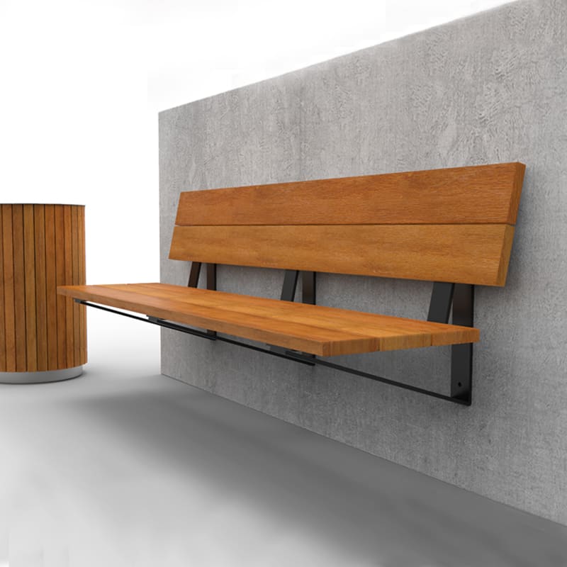Modern, wall-mounted, cantilevered seat. Hardwood battens in colours with a triangular steel frame in powder-coat colours or a galvanised finish.