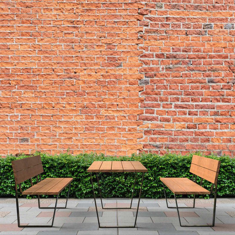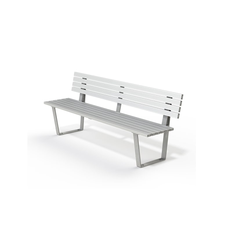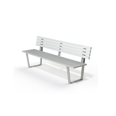 Minimalist seating style with a backrest. Battens in hardwood, Duraslat™ XG, aluminium. Tapered steel frame in powder-coat or galvanised finishes.