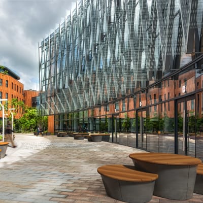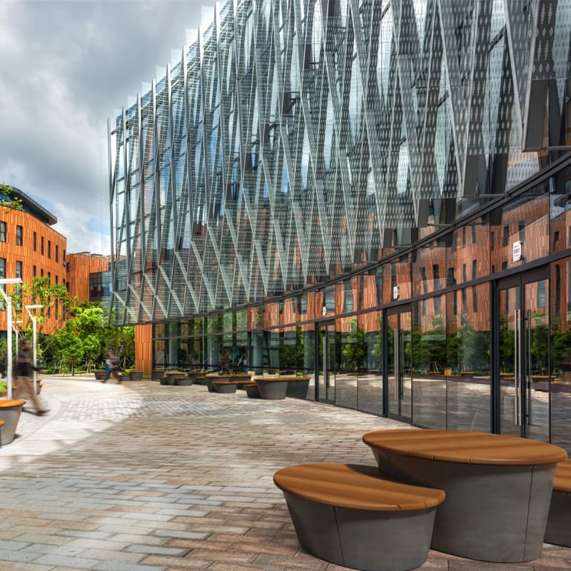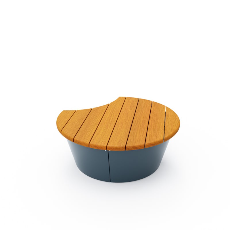 Modern, modular, circular interlock bench seating in a medium low size with Blackbutt hardwood battens and a steel frame in 27 powder-coat colours.