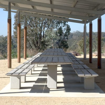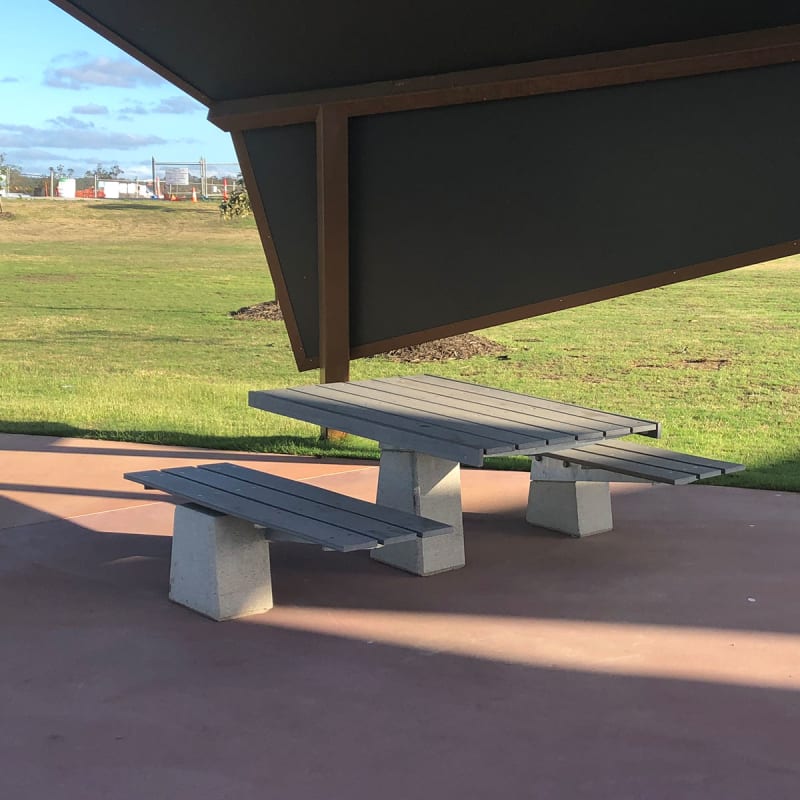 Robust block table design with a concrete base. Hardwood and Duraslat™ XG battens with steel framing details in powder-coat or galvanised finishes.