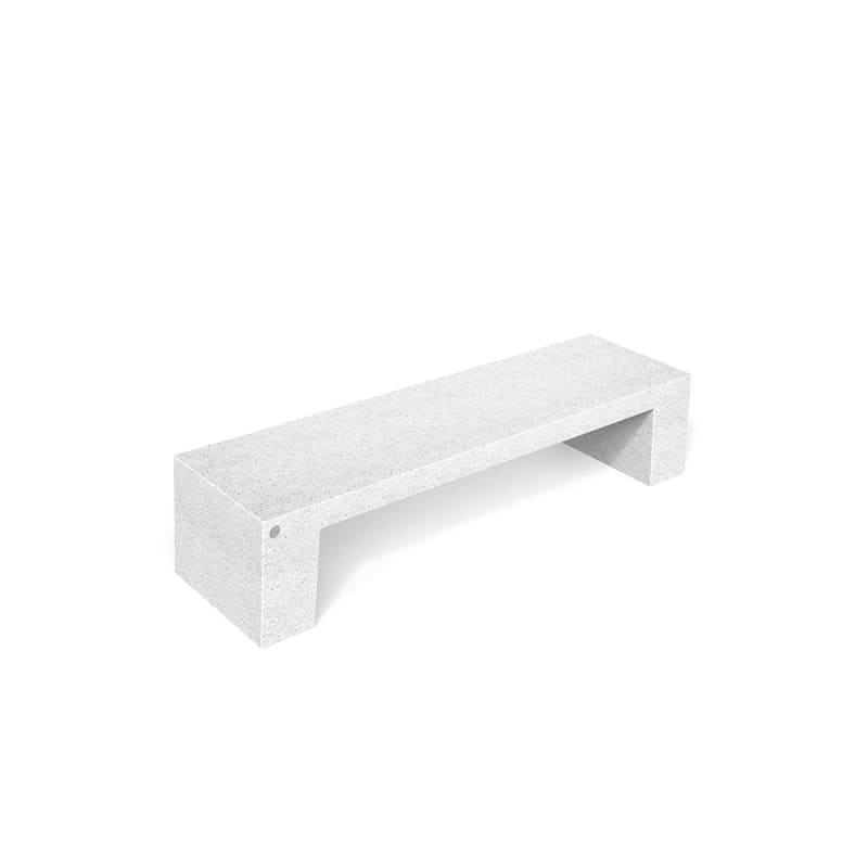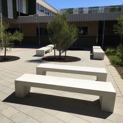 Classic, boxy, concrete bench. Its solid form grounds the design to its environment. Its simplicity allows the landscape in which it sits to shine.