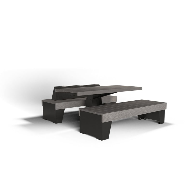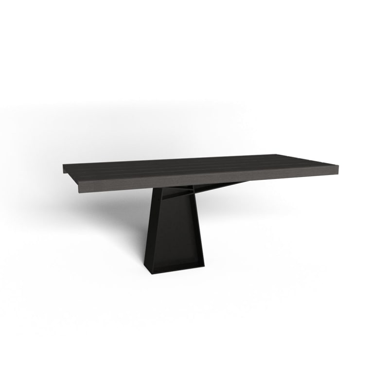 Modern outdoor table with contrasting finishes, asymmetrical details. Battens in Duraslat™ XG colours and steel frame in powder-coat finishes.