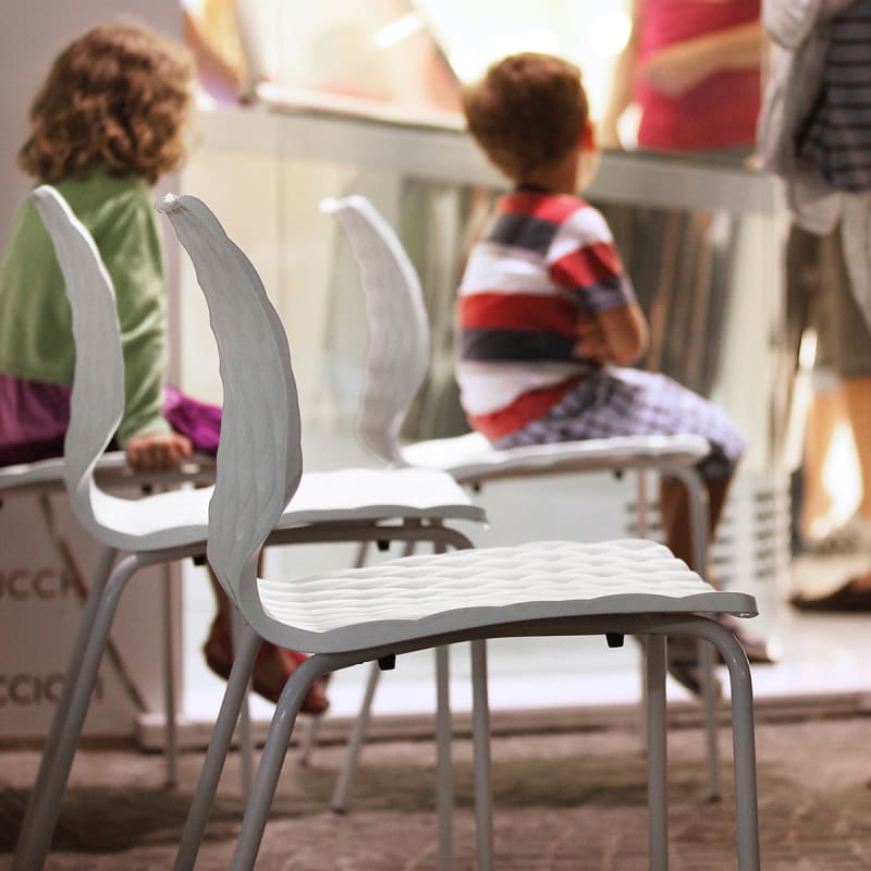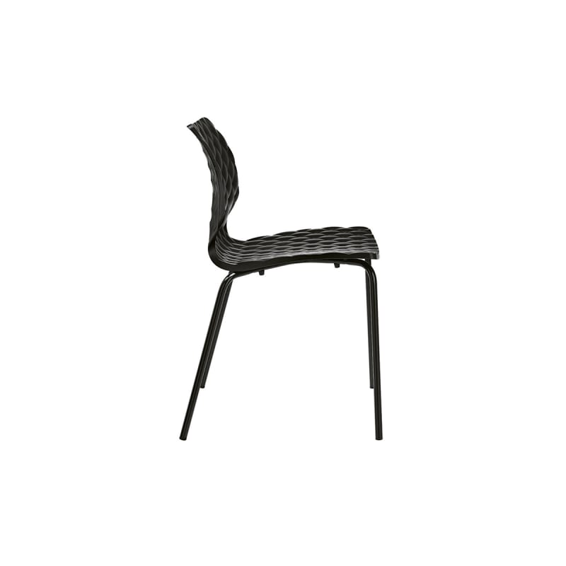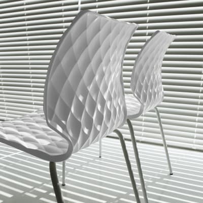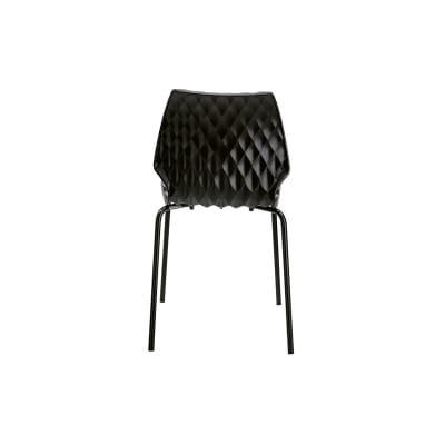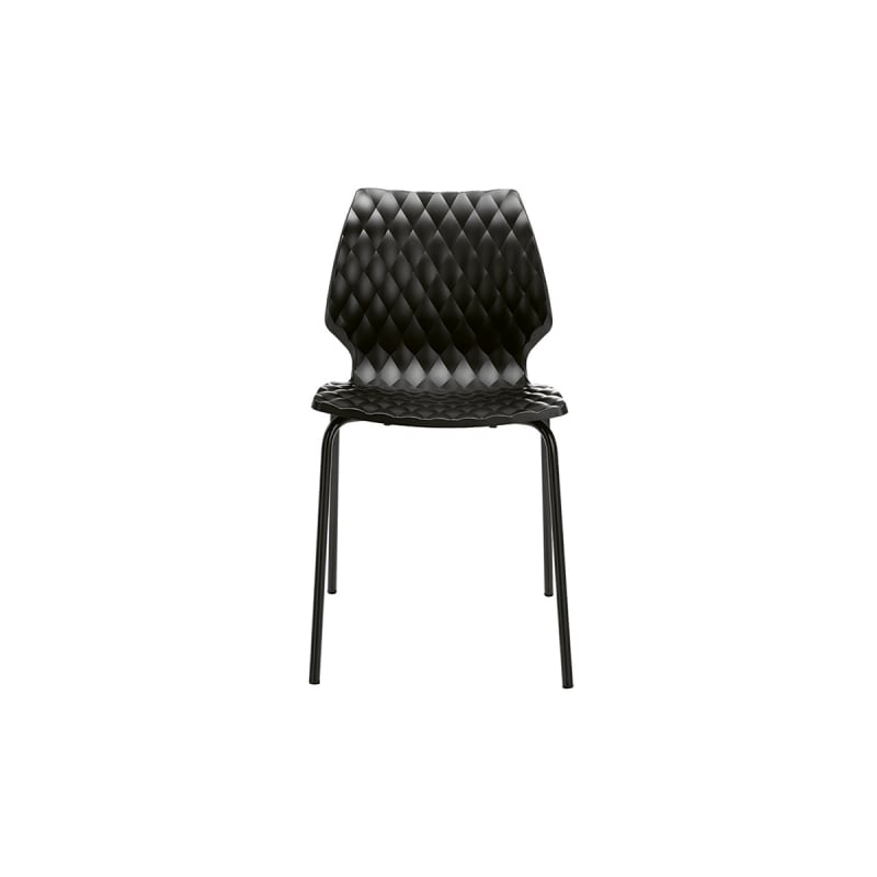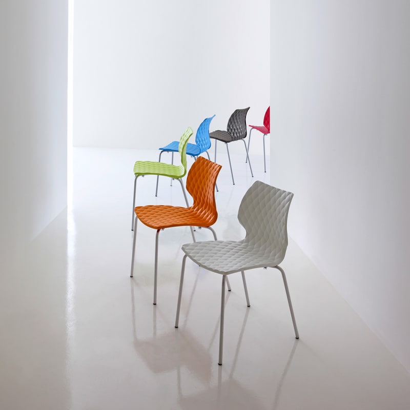 Modern chair with quilted-look polypropylene seat shell in 10 colours. 4-leg steel frame available in 15 powder-coat colours and a chrome finish.