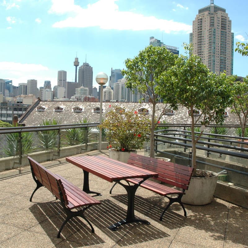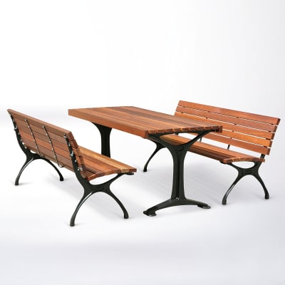 Timeless classic table design. Hardwood, Duraslat™ XG, aluminium battens with an elegant cast aluminium frame in powder-coat finishes or polished.