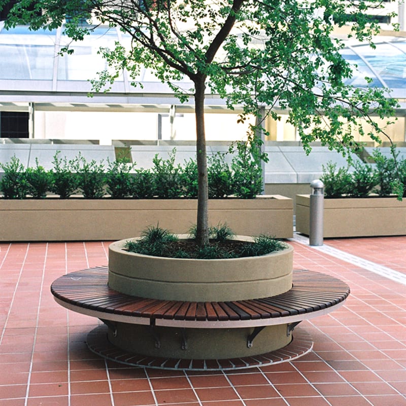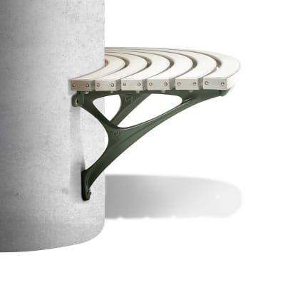 Curved wall-mounted seating. Hardwood, Duraslat™ XG, aluminium battens with an elegant cast aluminium frame in powder-coat finishes or polished.