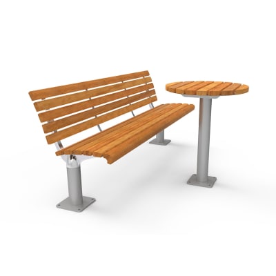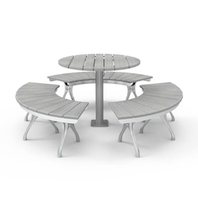 Timeless classic table design with circular top. Hardwood or Duraslat™ XG battens with a galvanised steel post frame in powder-coat finishes.
