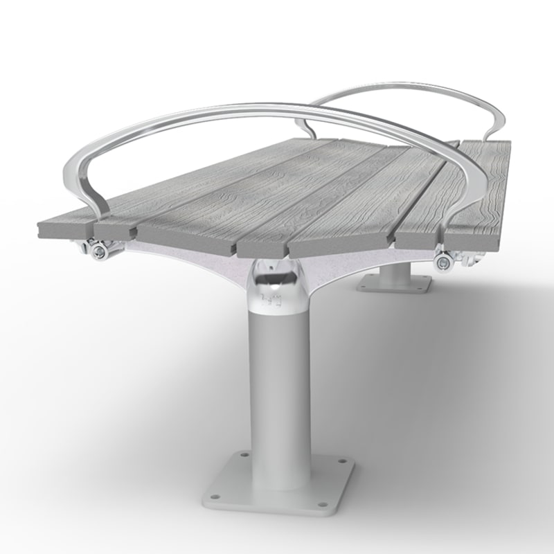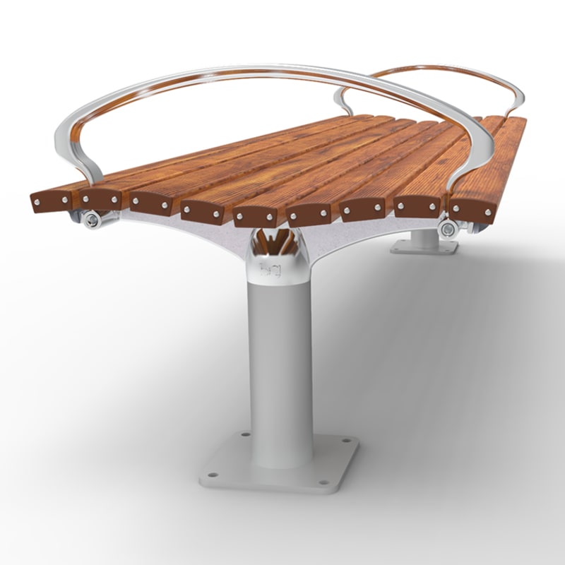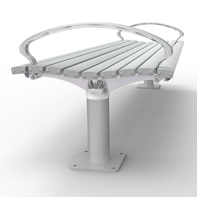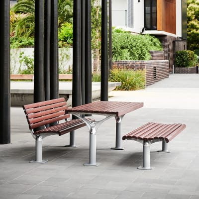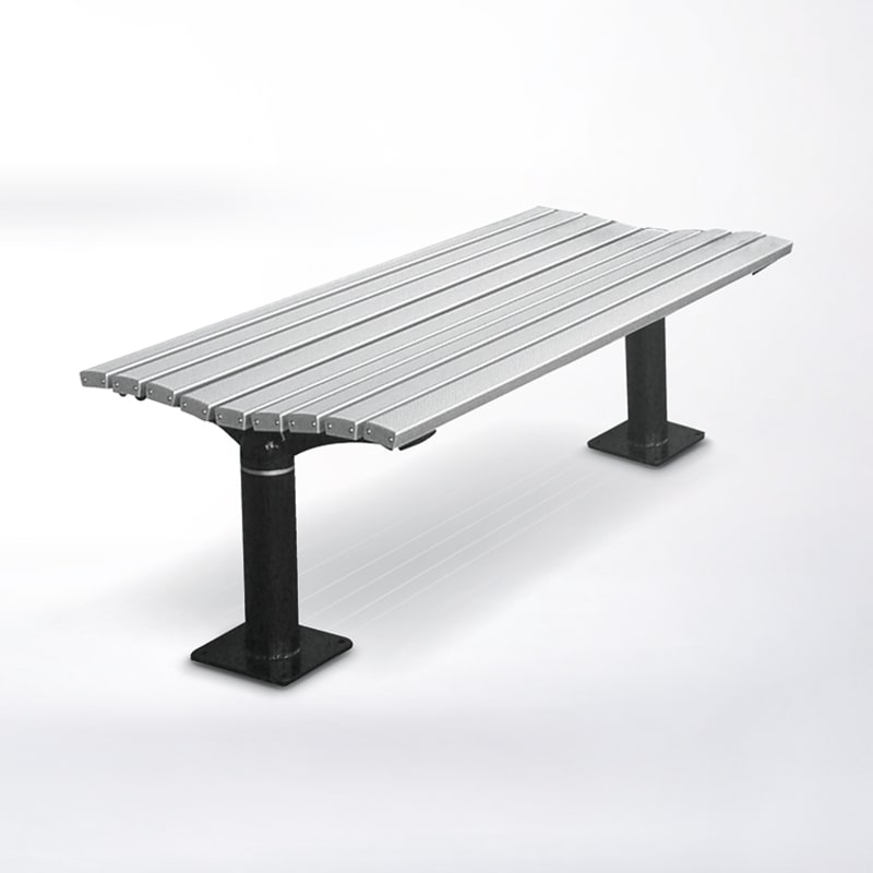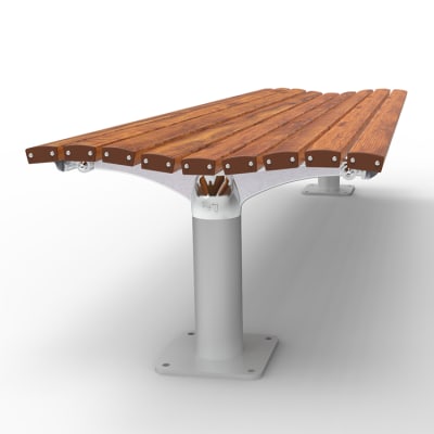 Timeless post bench. Hardwood, Duraslat™ XG, aluminium battens with an elegant cast aluminium frame in powder-coat finishes or polished.