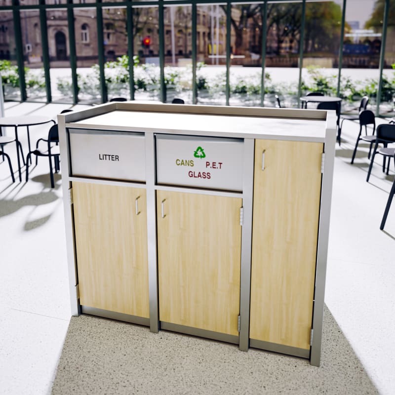 Double bin stations with tray return, cleaner’s cupboard. 120L. Stainless steel frame. Laminate, v-groove compact laminate options.