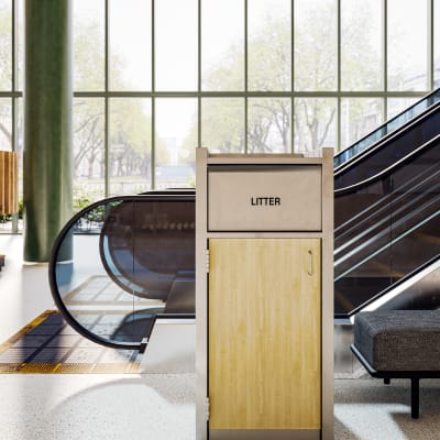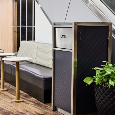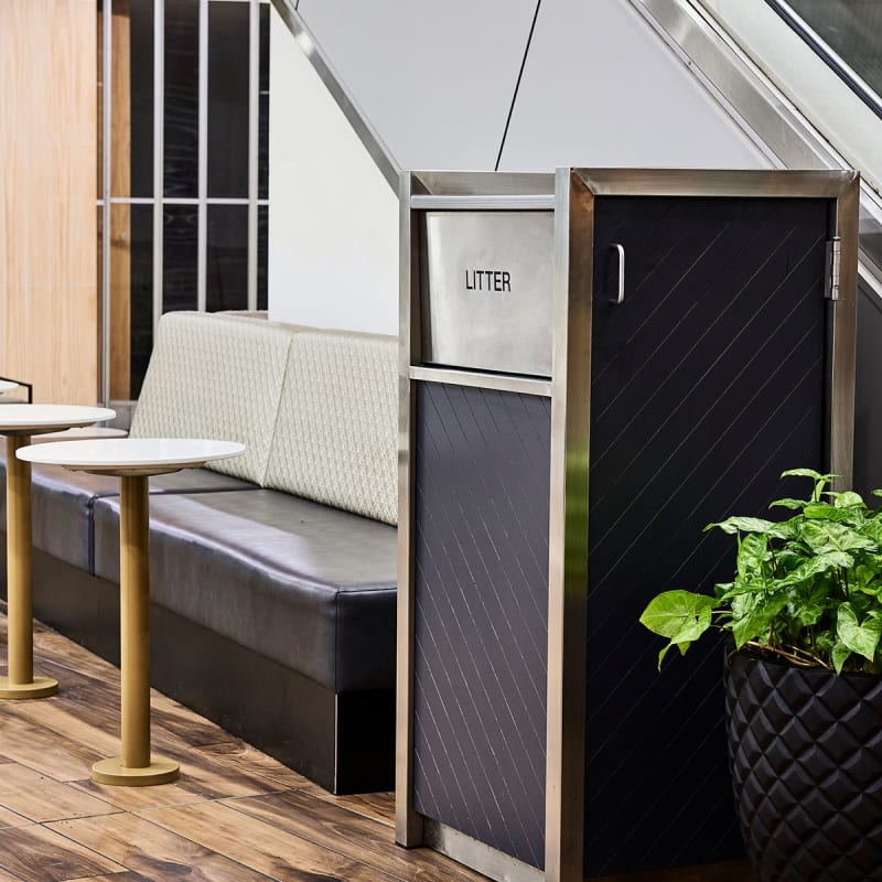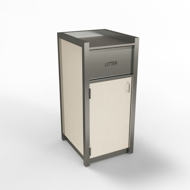 Single bin stations with tray return. 120L capacity. Stainless steel frame. Laminate, v-groove compact laminate options.