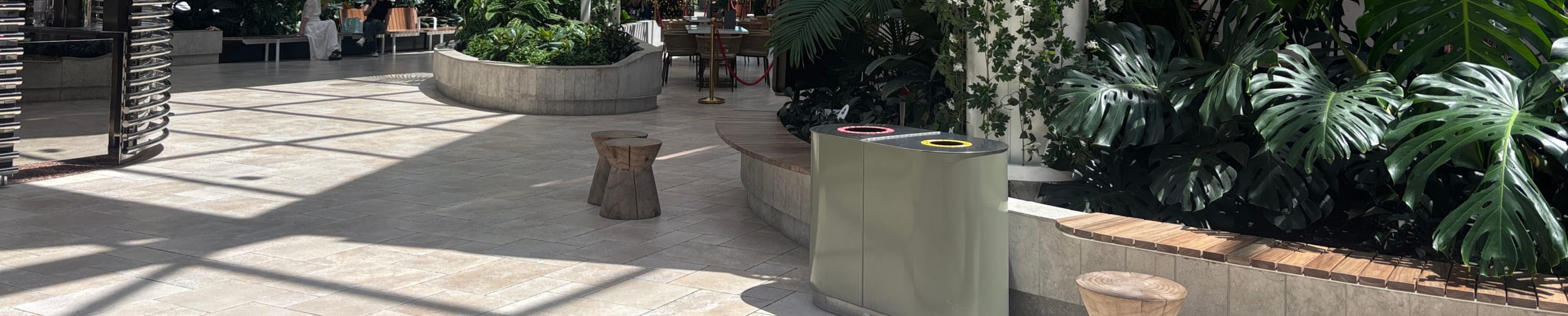 Our minimalist Fremantle bins were selected for the project, with versions featuring a hood for outdoor spaces and a sleek, hoodless design for indoor areas. Finished in a Mangrove Satin powder-coat, Fremantle’s modern, clean aesthetic perfectly complements the space, where nature is heroed throughout the design.