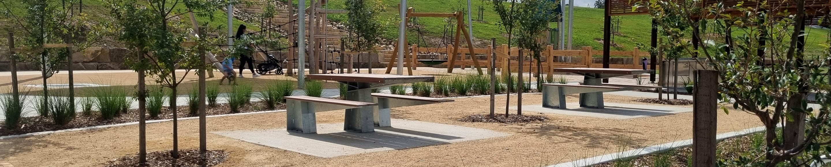 Paterson Design Studio selected key products from our Prospect Collection, recognised for its bold asymmetrical forms and robust, high-performance materials—ideally suited to public parklands and urban spaces. Combining a grounded concrete base with a refined industrial steel frame, the collection offers durability with a light visual footprint. Products installed include Truss Benches, Truss Tables, bin enclosures, and drinking fountains—each designed to integrate seamlessly into the natural setting while meeting the functional demands of everyday use.