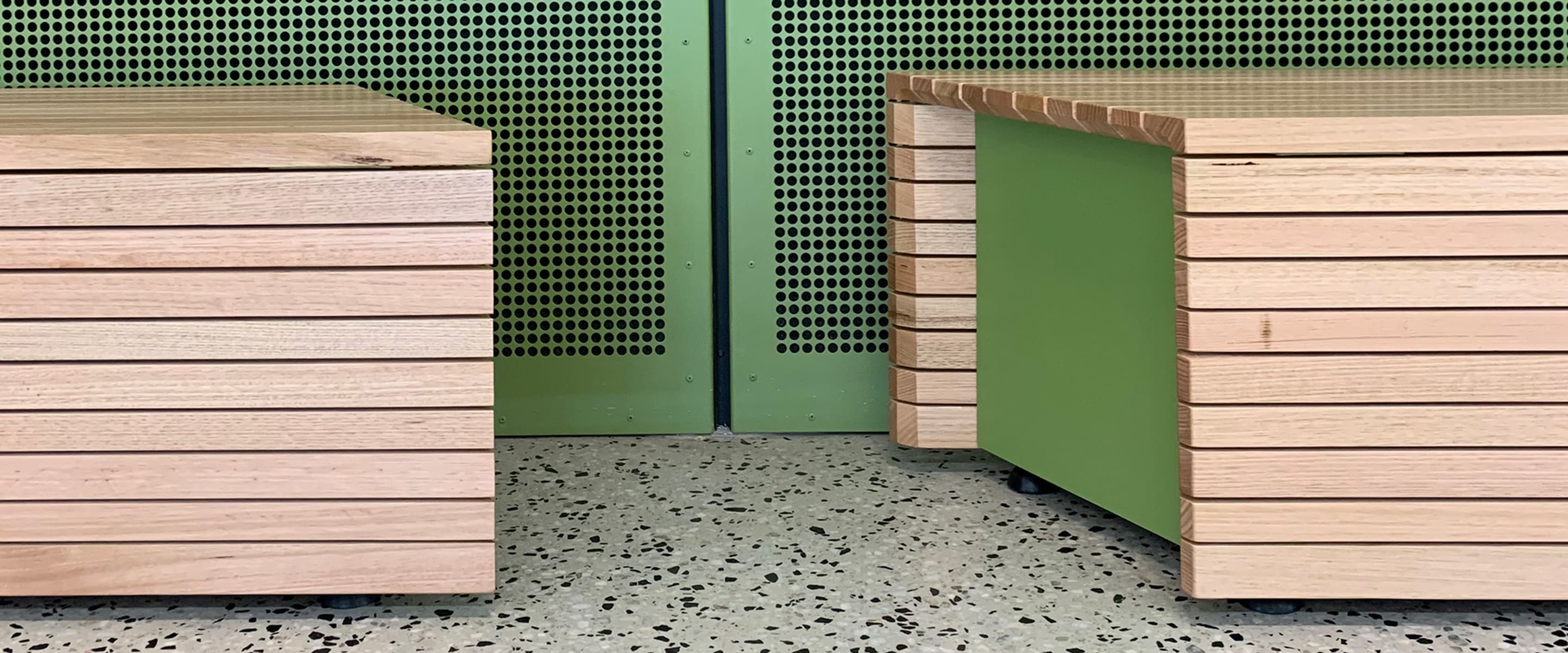 The soft green highlights in this project truly set it apart. Botton + Gardiner collaborated closely with Yarra Valley Grammar on product and finish selection, choosing a custom powdercoat colour (Interpon Sable Gilded Green) for the bench ends to match architectural details throughout the space. The light blonde Victorian Ash hardwood adds warmth to help maintain the building's open and airy vibe, whilst keeping the focus on the art.